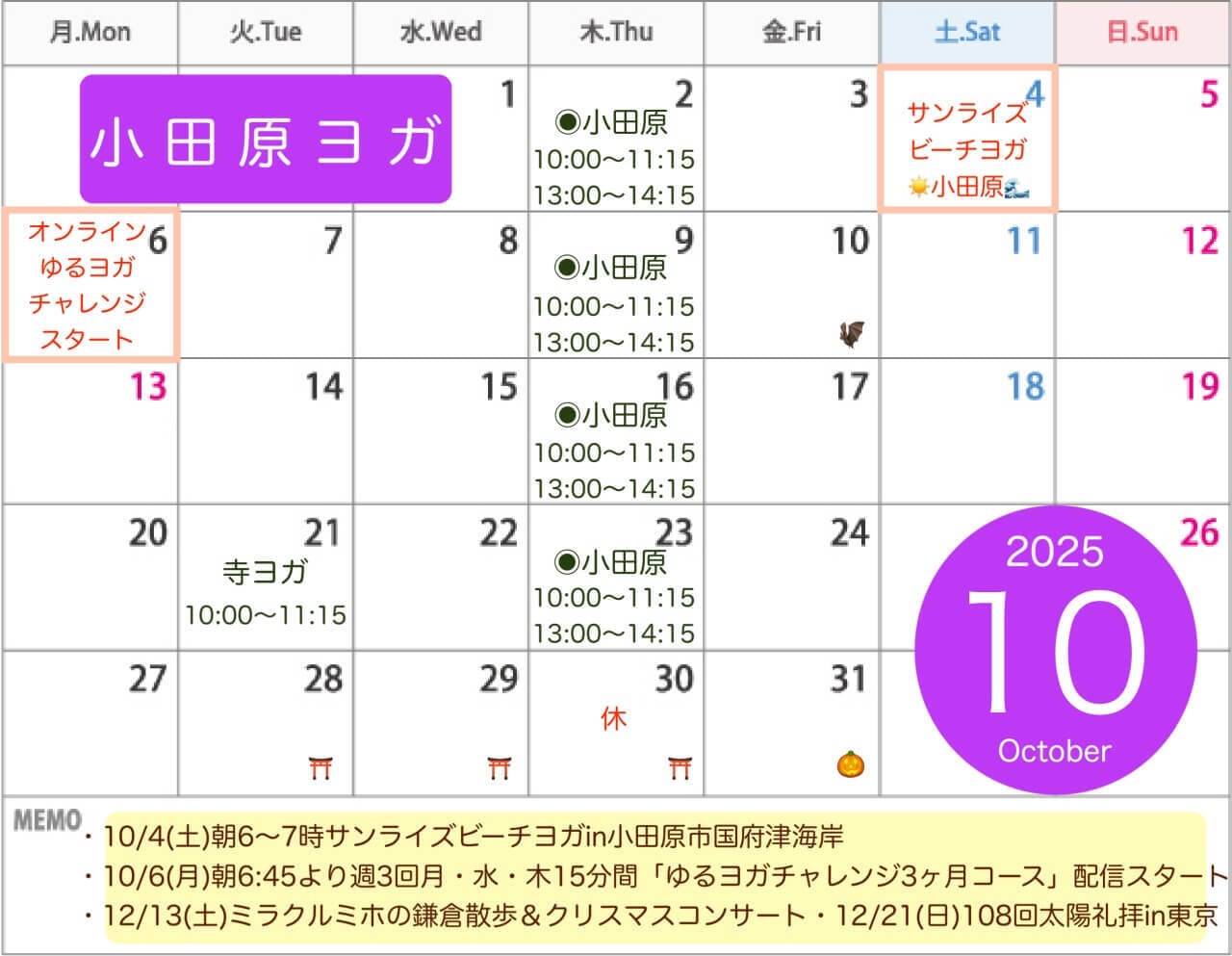2025年10月ヨガスケジュール(閲覧用) | たまヨガ小田原
